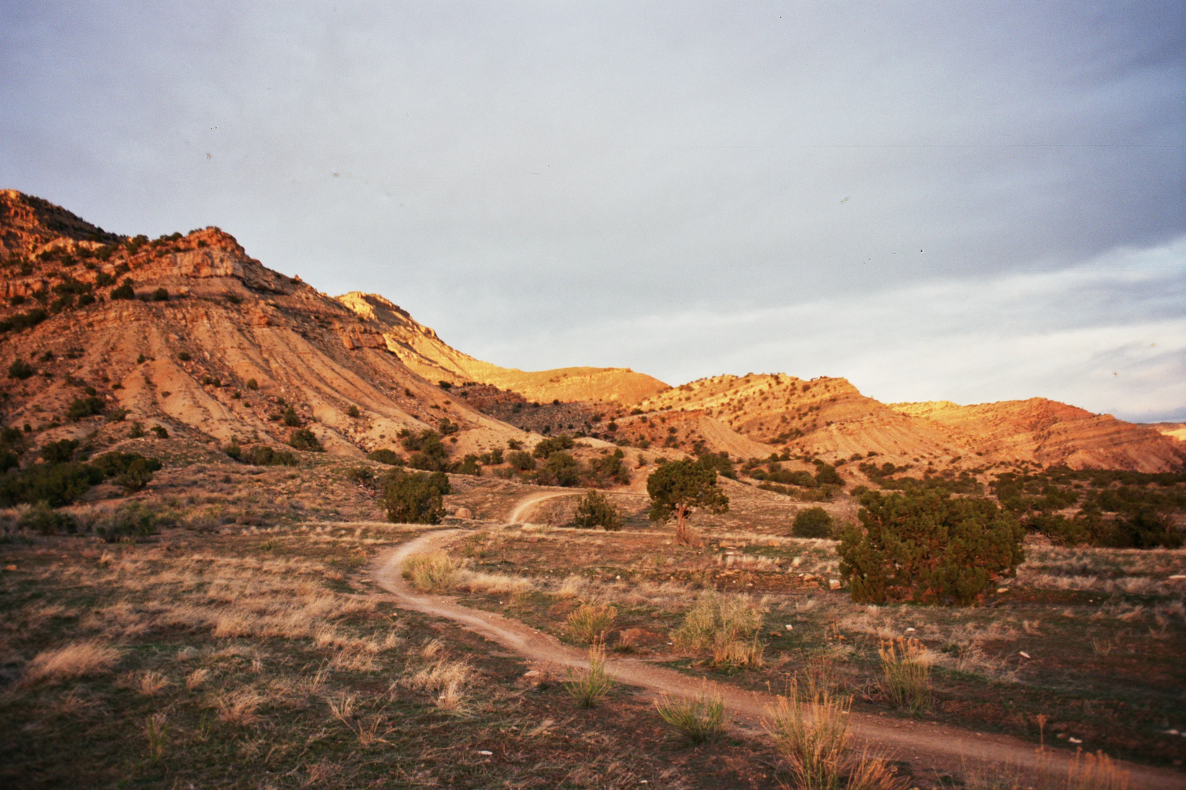 We began to ride the opposite direction, after filling water bottles and talking ourselves out of the mind trap of the gate. Mind the gate. The first road that merged with ours we began to follow. It climbed westward into the hills. The dirt was significantly softer than the gravel road we had been on, and the difference in feel and sound was welcome. Our tracks imprinted clear as the coyotes’, and we began to climb on blind faith towards an unknown campsite with an unknown view.