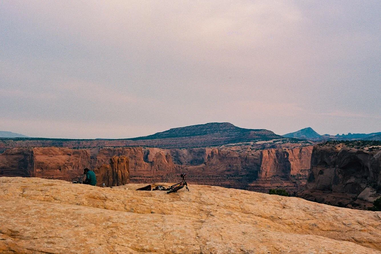 We depart during a warm afternoon, flowing over sharp limestone of the Kaibab formation. Ponderosa pines provide shade and scent, and despite the ratcheting of our freehubs, Kaitlin and I share conversation for some time. I become more aware of the composition of the rock in contrast to the soft, organic soil as large, jagged pieces poke out from under litter and duff. A viewpoint offers a peek at the edge of the Grand Canyon, a hole in the ground, the end of the Earth, a surprise horizon. All we can see from this point is Kaibab limestone and its grey-yellow outcroppings. The Moenkopi is all but gone from this landscape, and reminds us of the impermanence of structure in a universe bound for chaos.